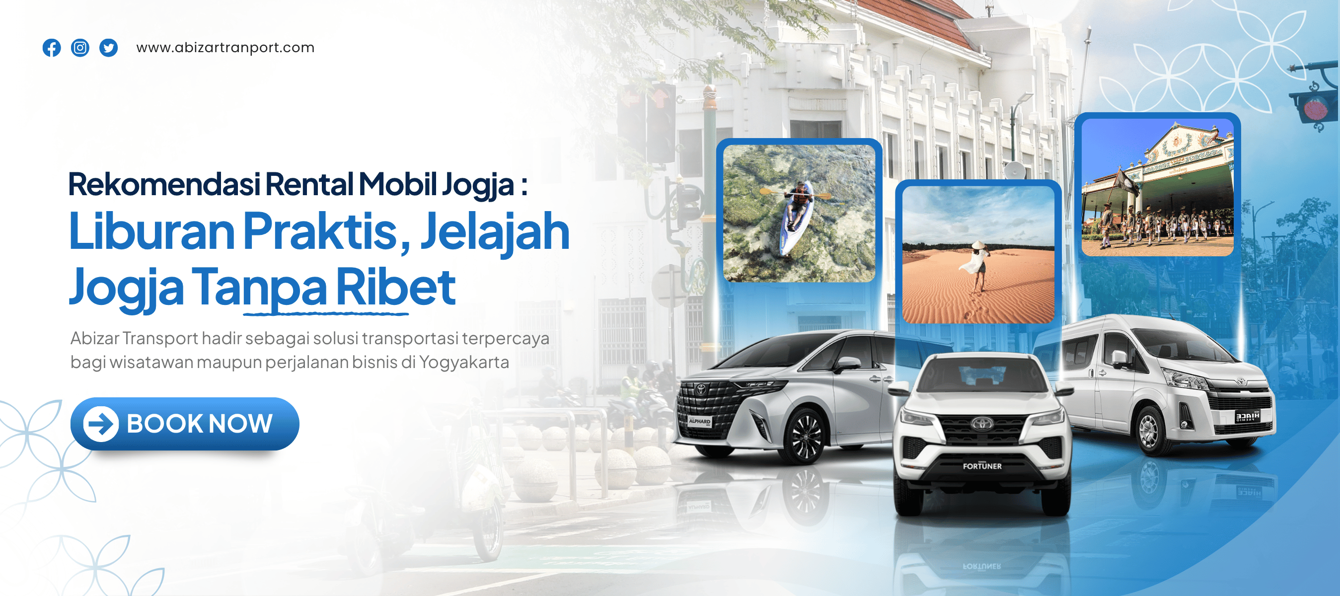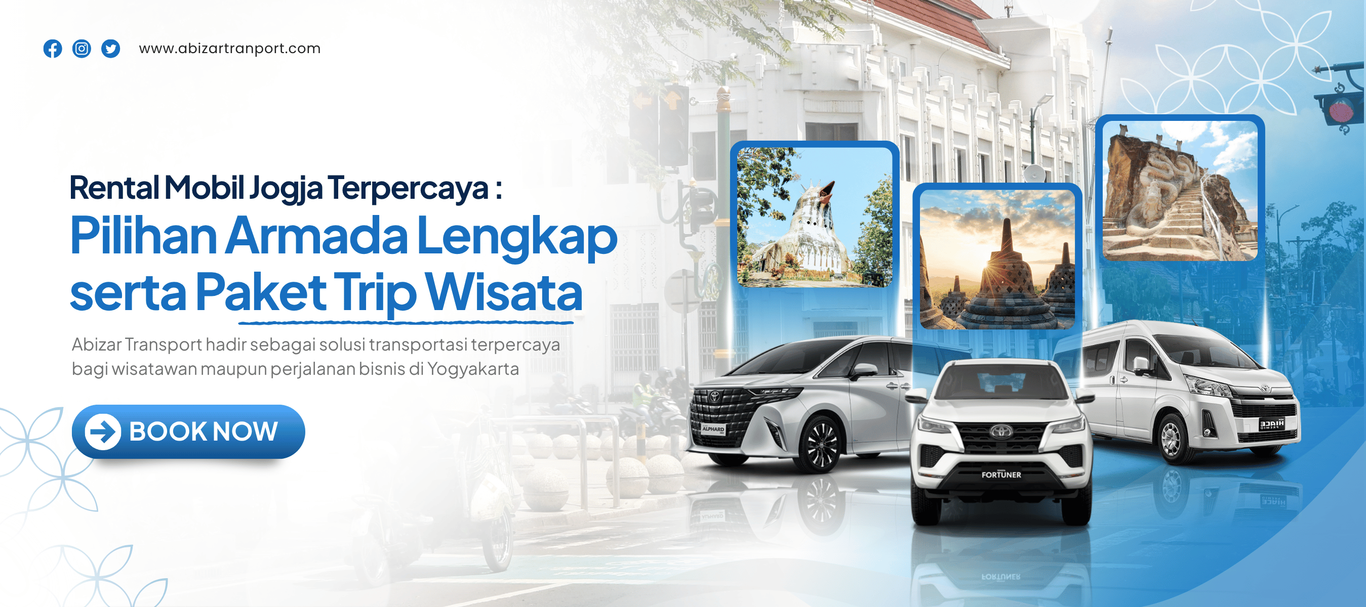 Abizar Transport hadir sebagai solusi terpercaya untuk kebutuhan sewa mobil di Yogyakarta dengan layanan yang profesional, mudah, dan harga yang bersahabat. Kami menyediakan berbagai pilihan kendaraan terbaik yang siap digunakan untuk berbagai keperluan, mulai dari perjalanan wisata, bisnis, hingga kebutuhan harian Anda.